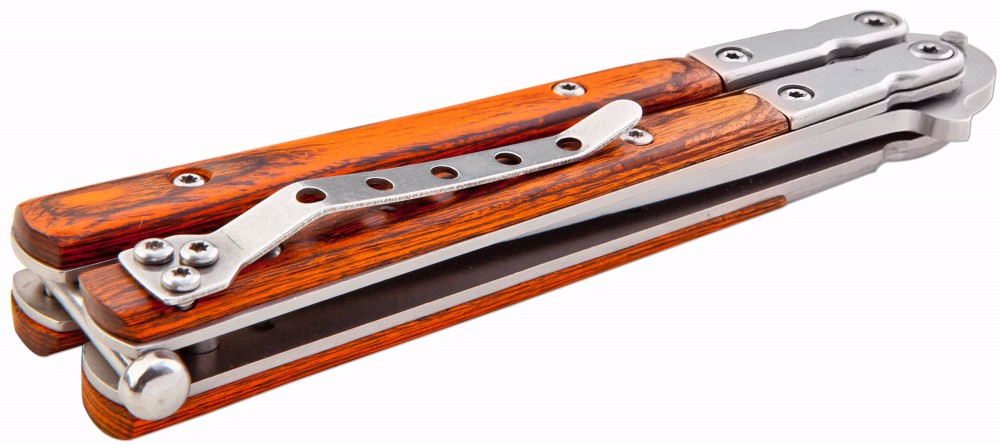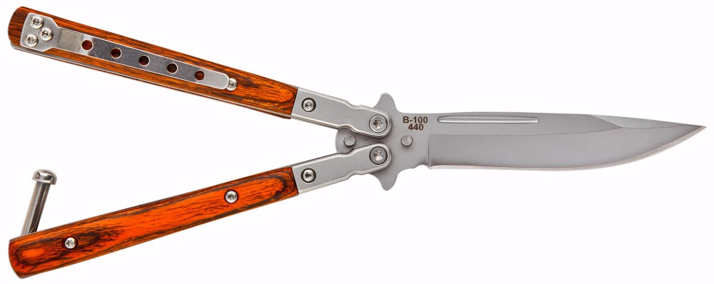 Нож балисонг Чёткий расклад B-100 – это известный благодаря киноиндустрии нож-бабочка, практически культовое изделие благодаря его применению в качестве предмета для жонглирования. Вращать нож-балисонг интересно не только подросткам, многие взрослые с удовольствием оттачивают свое мастерство вращения.