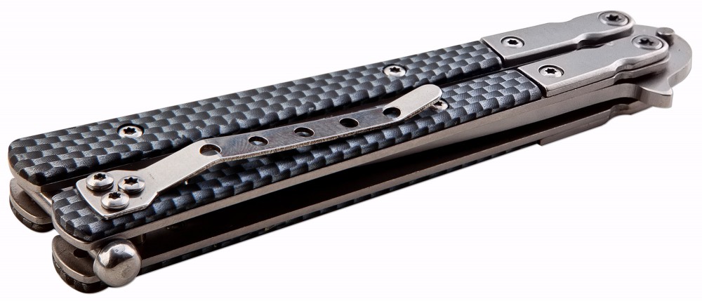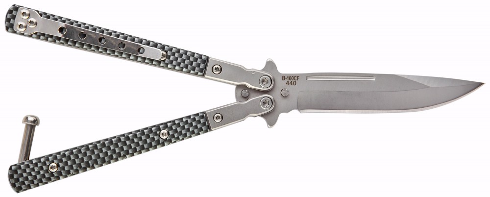 Основной материал изготовления – нержавеющая сталь 440 с хорошей твердостью (55-57 Hrc). Нож отлично справляется с задачей нарезки продуктов питания или использования его в быту. Клинок имеет антибликовую обработку. Для удобного ношения нож балисонг В-100CF имеет клипсу. Длина клинка – 8,8 см, общая длина – 19,8 см.