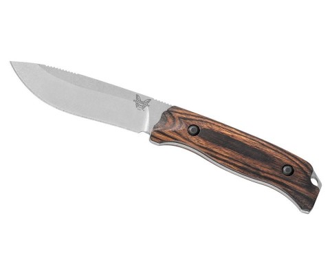 Нож марки BM15001-2 Saddle Mountain Skinner является охотничьей моделью и выполняется в двух вариантах с различными рукоятями. Они могут быть изготовлены из дерева или порошковой стали. Отметим, что клинок состоит из стали, твердость которой составляет 62HRC.