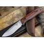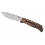 Модель больше похожа на скиннер, поэтому оснащена соответствующим клинком и функциями. В качестве накладок данный нож оснащен древесно-слоистым пластиком. Под этим словосочетанием подразумевается древесный шпон, который прессуется под большим давлением. Благодаря такой технологии, рукоять на долгое время сохранит теплоту дерева и эргономику. Также, она не боится влажности и древесных насекомых. Рукоятка выполнена достаточно аккуратно и состоит из двух небольших пластин.