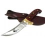 На клинке присутствует так называемый "чойл". B0401RWS хорошо принимает участие в деликатных работах. Для изготовления ножа такого типа применяется технология Fulltang, это значит, что хвостовик доводится до окончания рукоятки, при этом повторяет ее контур. Это помогает с одной стороны придать надежности конструкции, с другой увеличить ее вес до 320 граммов. Для того, чтобы создать прочный и твердый клинок, используется сталь марки 420 HC, которая не ржавеет и стойко переносит воздействия окружающей среды. Такая сталь производится компаниями Европы и американцами с одной стороны, и китайцами со второй. Западная версия смотрится понадежнее. Клинок ножа имеет форму clip-point. Ножи марки Бак часто применяются в охоте и в туристических целях. Нож нескладной, его фиксированная длина 254 мм, на клинок уделяется 121 мм. Толщина клинка равна 4.6 мм. Материалом для рукояти служит дерево, цвет коричневый. Нож данной марки не входит в класс холодного оружия и может продаваться в РФ.