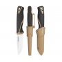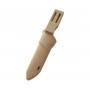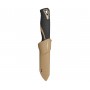 В изготовлении рукоятки применен материал PP+TRP. Этот материал представляет собой сочетание синтетического полипропилена и прорезиненного покрытия. Сочетание этих материалов известны своей износостойкостью и хорошим сопротивлением к воздействию температур. Рукоятка имеет ребристую поверхность, благодаря чему она не скользит в руке, даже при длительном применении. В рукоятку встроена выемка для темляка и добавлены насечки перед частью с лезвием для удобного расположения большого пальца. Ножны также изготовлены из полипропилена, только без добавления резины.