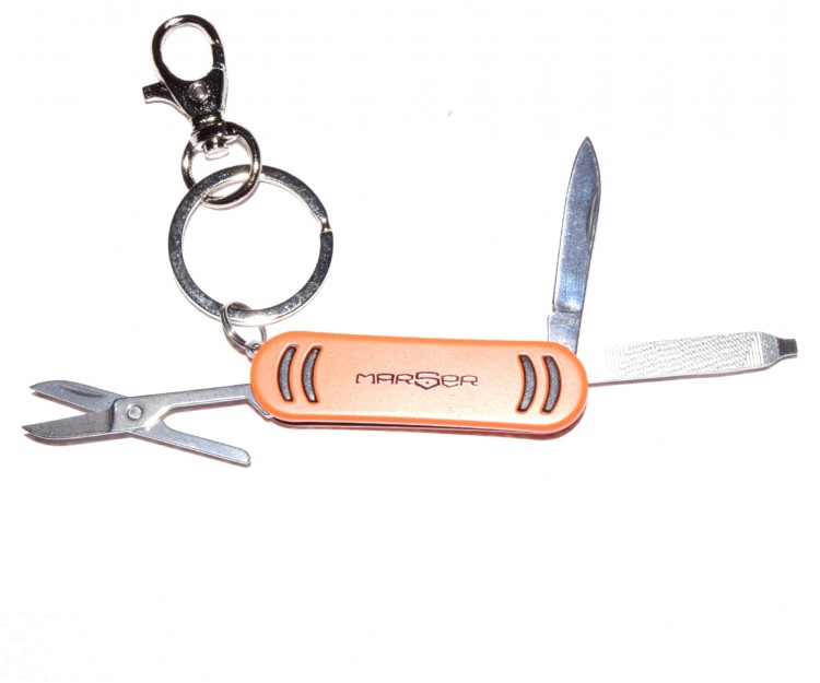 Мультитул Marser с рукоятью оранжевого цвета. Набор инструментов включает в себя нож, пилку, ножницы, карабин и кольцо для ключей. Инструменты выполнены из нержавеющей стали. Мультитул Marser Ast-131 выполнен в традиционном форм-факторе ножа-брелока и удобно крепится на ключе, обладая небольшим весом.