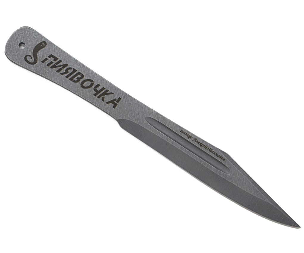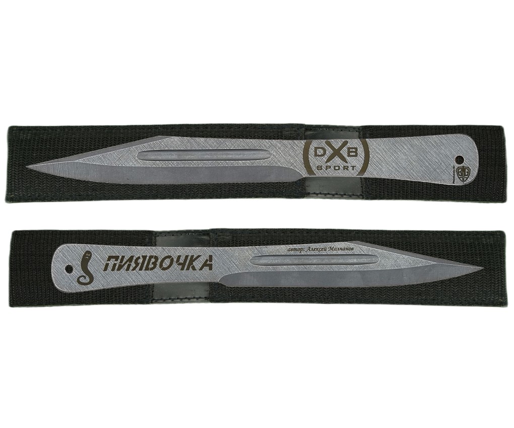 Нож "Пиявочка" это нож в котором сложились две легендарные модели ножей, разработанных для безоборотного метания: ножи СКАНФ и Вятич. Черты "родителей" легко узнаются в форме "Пиявочки", при этом, нож получился достаточно легким и изящным с собственным характером. Нож отлично ведет себя в полуоборотном и многооборотном (спортивном) метании. Каждый нож комплектуется индивидуалным нейлоновым чехлом, прошитым пластиковой вставкой.