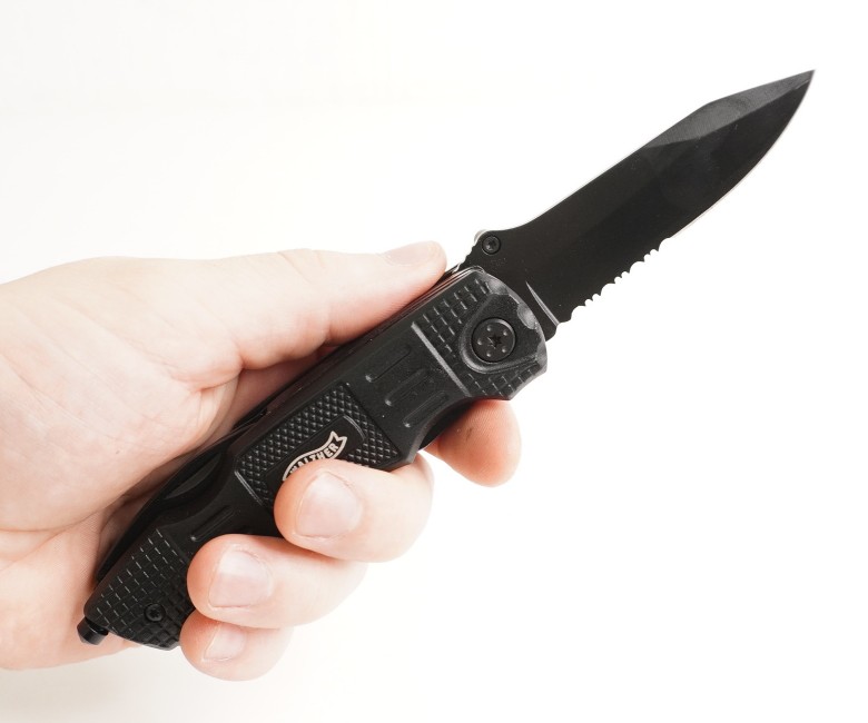 Изделие выполнено из нержавеющей стали (клинок) и алюминиевого сплава (рукоятка). Режущая кромка клинка комбинированная – часть ее, ближе к острию, гладкая, ближе к рукоятке имеется участок с серрейторной заточкой.