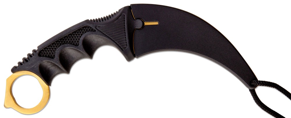 Материал для клинка – это нержавеющая сталь марки 440, с хорошими показателями твердости. Цвет клинка – золотистый., как и кольцо для продевания указательного пальца. В комплекте идут пластиковые ножны со шнурком. Общая длина ножа H-230 GOLD составляет всего 19 см, вес – 140 г, длина клинка – 8,9 см.