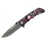 Рукоятка ножа Джокер-2 A-169 металлическая, украшена стилизованным рисунком. Рисунок на поверхность металла нанесен по специальной технологии, обеспечивающей сохранение внешнего вида на длительный период. Механизм открывания ножа – liner lock, для выброса лезвия необходимо нажать на плавник. Навершие инструмента имеет отверстие для установки страховочного шнура.