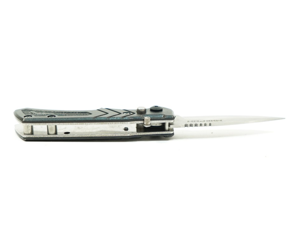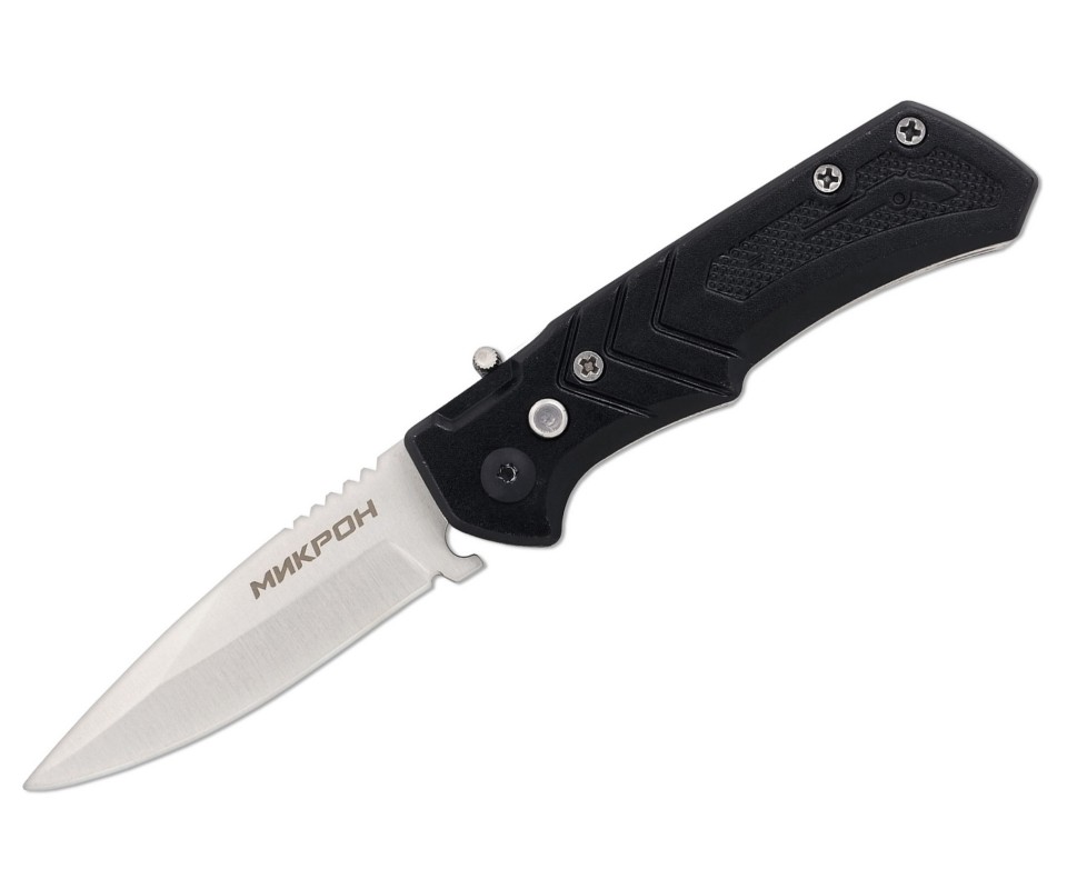 Нож полуавтоматический «Чёткий расклад» Микрон A-154 – это миниатюрный складной нож от проверенного бренда, универсальный инструмент для ежедневного использования. Клинок ножа имеет длину 6,2 см, выполнен из ножевой стали 440 и закален до 55-56 hrc. Скос обуха плавный, толщина обуха 2 мм. На клинке ближе к рукоятке имеется участок с насечками.