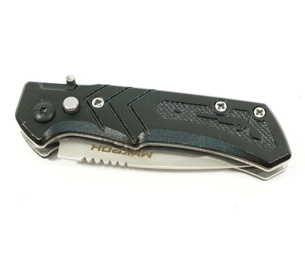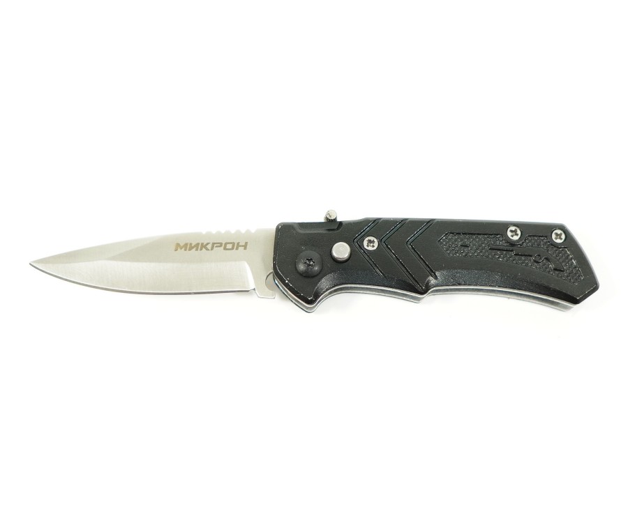 В данном изделии используется замок button lock – его механизм отличается простотой и надежностью. Рукоятка ножа Микрон A-154 металлическая, на поверхность рукоятки нанесен фактурный рисунок. Два подпальцевых выступа на рукоятке делают удержание ножа максимально комфортным.