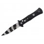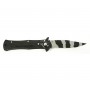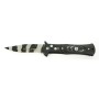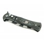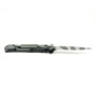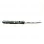 Клинок имеет выраженный скос обуха и острый кончик, удобный для прокола. Наличие гарды предохранит пальцы от соскальзывания на лезвие. Тип замка – button lock.