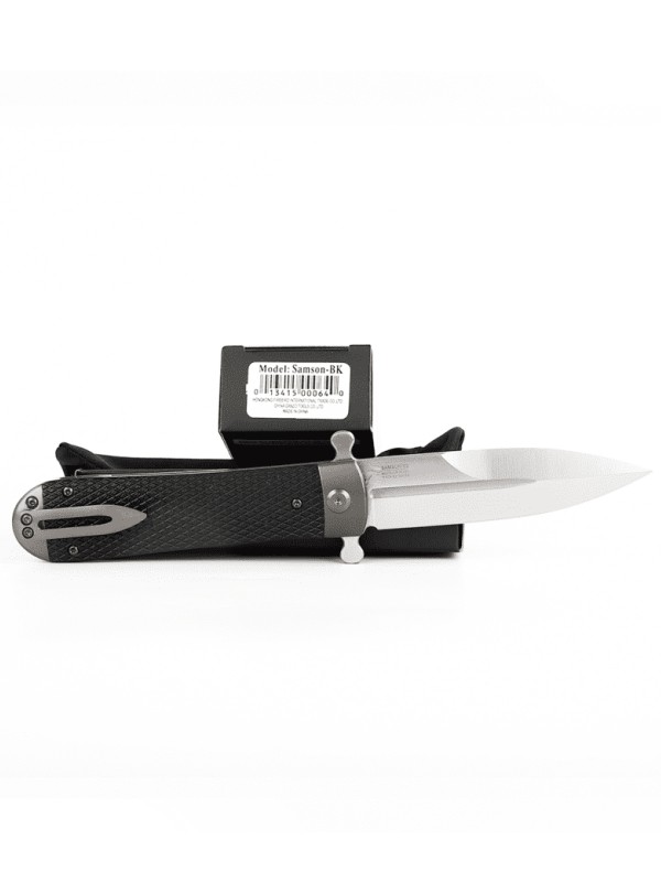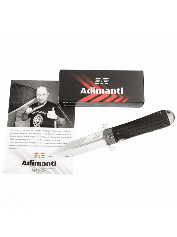 Нож Adimanti Samson имеет визуальное сходство с копьем благодаря симметричному клинку. Изделие рассчитано на использование как в городских, так и полевых условиях, поскольку оно имеет компактные габариты для комфортного ношения в кармане и обладает высокой стойкостью к воздействию агрессивных сред, в особенности ряда кислот и обычной влаги.