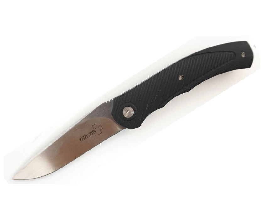 01BO355 - это хороший нож от немецкого поставщика, который успешно зарекомендовал себя на мировом рынке. Лезвие таких изделий изготавливается из дорогой, но в тоже время качественной стали VG10. Такой сплав производят в Японии, в нем присутствует кобальт с молибденом. Эти элементы помогают достичь хорошей прочности, а также вязкости. Satin finish, как обычно является противобликовым раствором, который помогает уберечь нож от появления царапин. Торцевой флиппер применяется при открытии лезвия. Для накладок на рукоять берется стеклотекстолит G-10. Ножи Boker выдерживают большие нагрузки и могут применяться хоть каждый день. Формой клинка 01BO355 является clip point. Нож имеет прямую заточку, клинок хромированный. Твердость клинка занимает 60-61 единицу по Роквеллу. Длина клинка определяется в 74 мм, при этом всё изделие занимает 171 мм. Вес ножа 01Bo355 равен 66 граммам. Из за скромных размеров, нож относят к разряду карманных. Liner Lock по традиции выполняет роль фиксатора лезвия. Толщина клинка равна 2.8 мм. Цвет рукояти черный.