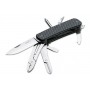 01BO824 Tech Tool Carbon 5 - мультитул с оптимальным набором инструментов для решения широкого объема задач в городских условиях, в походе или на охоте. Инструменты данного ножа выполнены из шведской стали Sandvik 12C27 повышенной твердости 58 - 60 единиц по Роквеллу. Они длительно держат заточку, не поддаются коррозии и противодействуют сколам. Главный клинок длиной 7,1 см имеет классическую форму Drop Point с толщиной по обуху 2,3 мм. Для его фиксации предусмотрен фиксирующий механизм Slip joint, препятствующий захлопыванию лезвия. Остальной набор предусматривает: серрейторное лезвие, ключ для бутылок, обычную и крестовую отвертки, ножницы, шило, плоскогубцы, шило и кольцо для крепления.