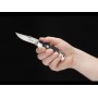 BK112770 - это модель ножа, которая была выпущена всего в 300 экземплярах. Клинок этой модели выполняется из стали высокого качества, это D2 - очень популярная марка ножевых сталей во всем мире. За такое качество нож имеет вполне справедливую цену. Шлифом, то есть сечением клинка выступает Hollow Grind, клинок имеет специальное покрытие Polished blade. Для открытия ножа нужно использовать обе руки, цепляя выемку под ноготь. Рукоятка смотрится просто шикарно, ведь она изготовлена из натуральной кости. Для темляка в ней имеется специальное отверстие. Если рассматривать классификацию ножа, то это Folding Hunting Knife. Форма клинка - clip point. Нож за скромные габариты часто называют карманным, его особо полюбили охотники. Клинок имеет цвет хрома, рукоятка по традиции имеет черный цвет. Заточка ножа имеет прямой тип. Для того, чтобы не выпадало случайным образом лезвие ножа, имеется его фиксатор в виде замка Back Lock. Твердость клинка равна 60-62 единицам HRC. В сложенном положении длина ножа равна 105 мм. Компания Booker - это европейский лидер в индустрии ножей.