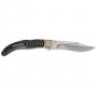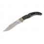 Нож складной C-159 «Ножемир» - это очень эффектный по исполнению инструмент известного производителя, большой и практичный. Нож выполнен из легированной стали марки 65Х13, устойчивой к влаге и процессам коррозии, с показателем твердости клинка 55-56 hrc. Клинок формы боуи отличается характерным вогнутым скосом обуха, и представляет собой фальшлезвие. Острие этого ножа несколько приподнято вверх.