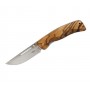 Клинок ножа с прямым обухом отлично подходит и для реза, и для прокола, делая изделие универсальным инструментом. На рукоятке установлены накладки из натурального дерева с насечками для повышения удобства хвата. Форма рукоятки удобная, с выемками для пальцев. Предусмотрено отверстие для темляка. Длина ножа 21,3 см, длина клинка 9,3 см. Упакован в коробку из картона.