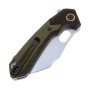 Клинок также оснащён удобным флиппером. Накладки на рукояти выполнены из двух кусков G10 чёрного и зелёного цвета, сама рукоять удобной формы и отлично лежит в руке. При всём этом, несмотря на свои размеры, нож довольно лёгкий.