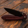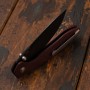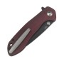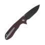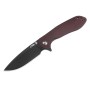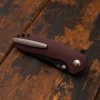 Рукоять из микарты бордового цвета имеет удобную и эргономичную форму, её удобно держать в руке, за счёт подпальцевой выемки осуществлять контроль реза очень удобно. Рукоять также оснащена удобной клипсой.