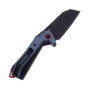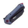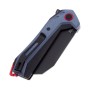 Рукоять выполнена в чёрном и сером цвете из G10, имеет крайне удобная форму с большим упором, который точно обезопасит ваши руки во время работы. Чёрно-белую рукоять отлично дополняет фурнитура красного цвета. Массивный клинок извлекается с помощь флиппера, рукоять оснащена клипсой.
