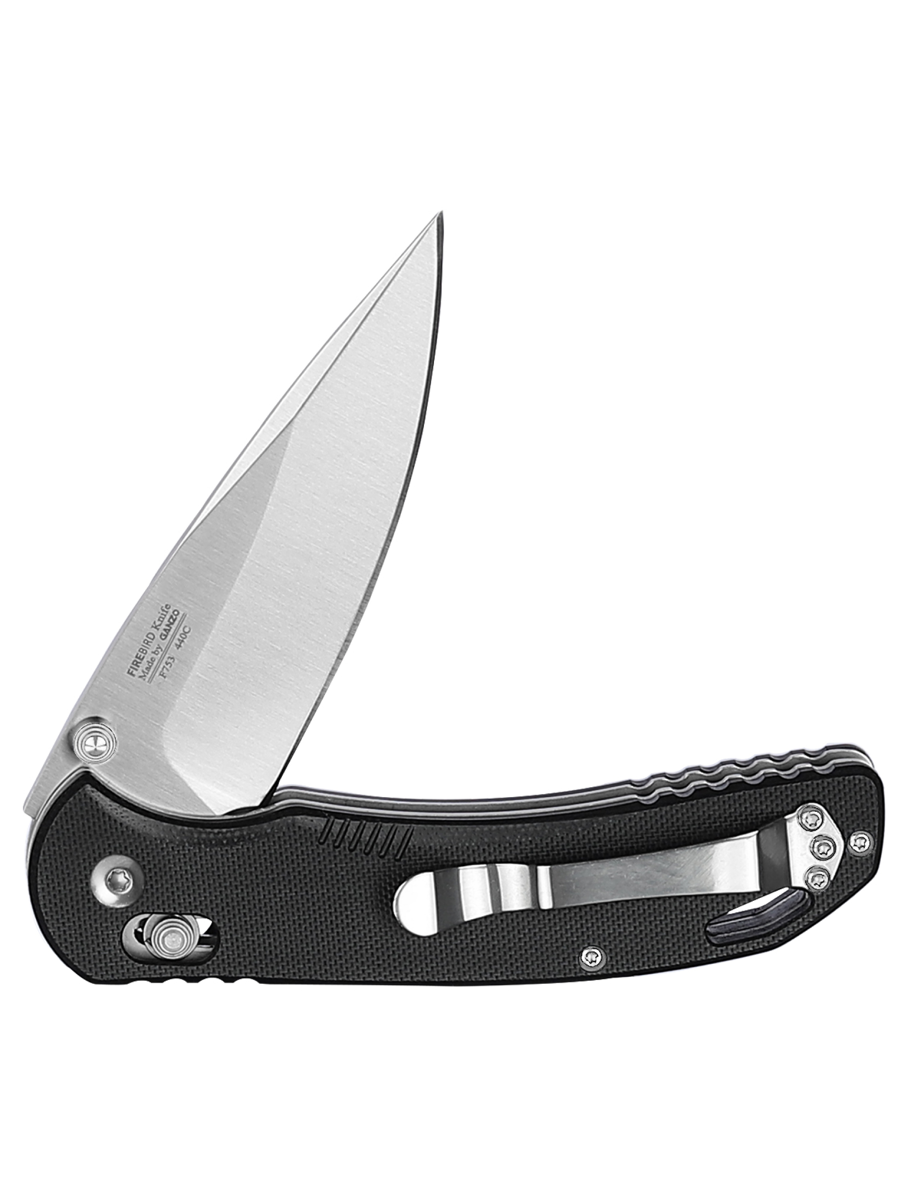 В открытом положении, размер модели Firebird F753M1 равен 17,8 см. Рукоятка этого ножа выполнена с использованием композитного материала G10. Он получен путем соединения стекловолокна с эпоксидными смолами. Этот материал совсем легкий, но по прочности практически не уступает стальной основе рукоятки. Мелкая текстурная накатка на стеклопластике помогает крепко держать нож в руках. Кроме того, нож можно дополнительно пристраховать при помощи темляка, который, при желании, вдевается в отверстие на ручке Firebird F753M1. Клипса же, используемая для ношения на ремне, изготовлена из стали.