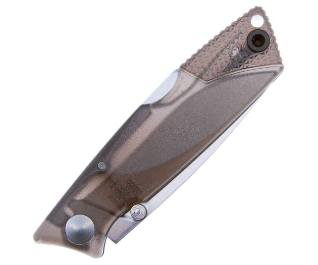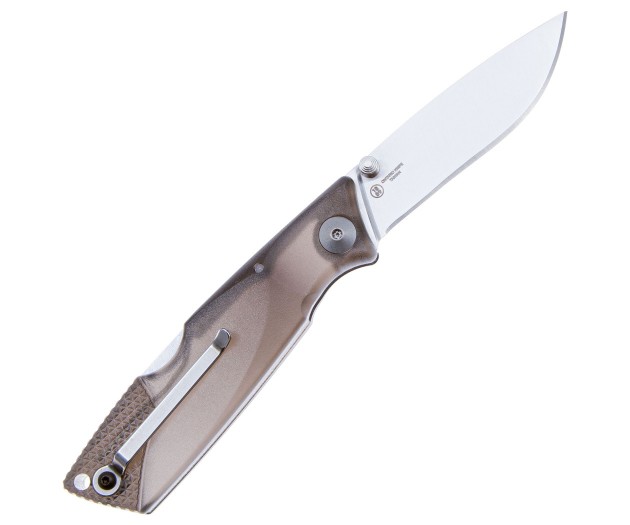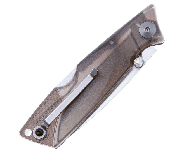 Удобный и универсальный клинок оснащён шпеньком, полупрозрачная рукоять хорошо лежит в руке. Нож оснащён клипсой для ношения.