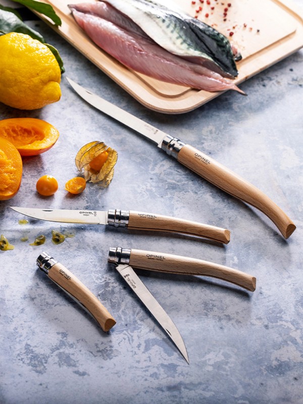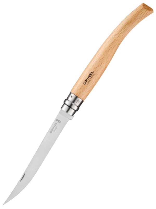Нож Opinel №12 обладает более узким и гибким лезвием, чем традиционные модели, поскольку предназначен для таких тонких кулинарных операций как разделка рыбы, мяса и птицы. Обтекаемая рукоять из бука создана для комфортного удержания ножа в руке. А благодаря складной конструкции и легкому весу его удобно брать с собой в любые поездки на природу.