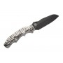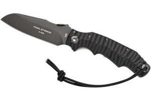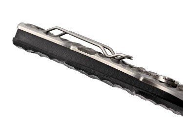 Рукоять Survival PF1037 закрытого типа из титанового лайнера с замком Frame-lock и плашами из G-10. Рукоять с подпальцевыми выемками имеет шикарную 3D-обработку. Здесь есть поворотный механизм блокировки. Она плотно “цепляет ладонь при любых работах. На рукояти предусмотрена проволочная клипса, которая позволяет ношение ножа острием вверх, и отверстие под темляк со страховочным тросом.