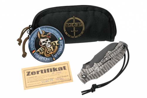 Форма клинка с широкими спусками на 2\3 лезвия имеет прямые спуски, которые создают довольно необычное для тактика сведение по всей кромке. Фальшлезвие в данном случае выполняет декоративную роль. Кончик этого ножа прост. Интересна линия обуха, которая резко поднимается от приспущенной спинки рукояти, образуя упор для фехтовального хвата с шайбой вместо шпенька. На клинке использована финишная полировка “Стоунвош” + эффект мутного зеркала - противобликовое и износостойкое покрытие PVD-Coating. Конечно, клинок украшен клеймом дивизии “Euro Ops Division”.