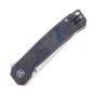 Клинок имеет сатиновое покрытие, извлекается с помощью удобного флиппера одной рукой. Накладки рукояти выполнены из нескольких слоёв G10 красного цвета и shredded карбона, что создаёт необычный контрастный узор.