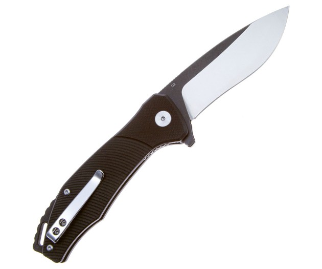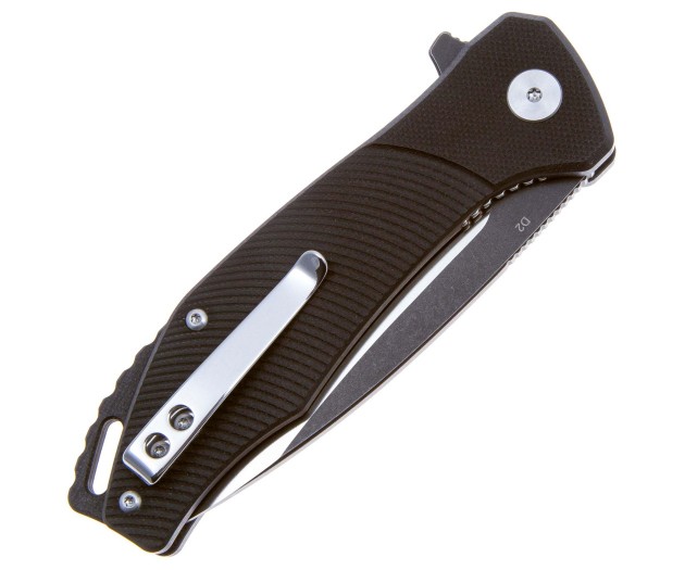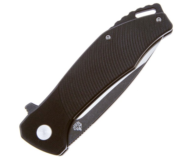 Верхняя часть клинка и обух имеют чёрное покрытие, сам же клинок имеет сатиновое покрытие. Рукоять из G10 имеет рельефный рисунок и удобную форму, что в сумме обеспечивает надёжное удержание ножа в руке.