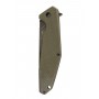 Общая длина ножа составляет 219 мм, толщина 3,5 мм. Вес 120 г. Основой накладки для рукояти послужил современный, сверхпрочный композитный материал G10. Это не что иное, как стеклоткань, соединенная с эпоксидными смолами. В результате образуется соединение, которое великолепно проявляет себя при практическом применении: выдерживает высокие температуры, удары, влагу, окрашивание. Металлическое основание рукоятки сделано из стали марки 420. Есть съемная стальная клипса и отверстие под темляк. Готовое изделие приобретает такие черты, как прочность, долговечность, стойкость к повреждениям. Клинок из ножа извлекается посредством флиппера и фиксируется стальным замком типа Frame-Lock. За скорость извлечения отвечает осевой роликовый подшипник.