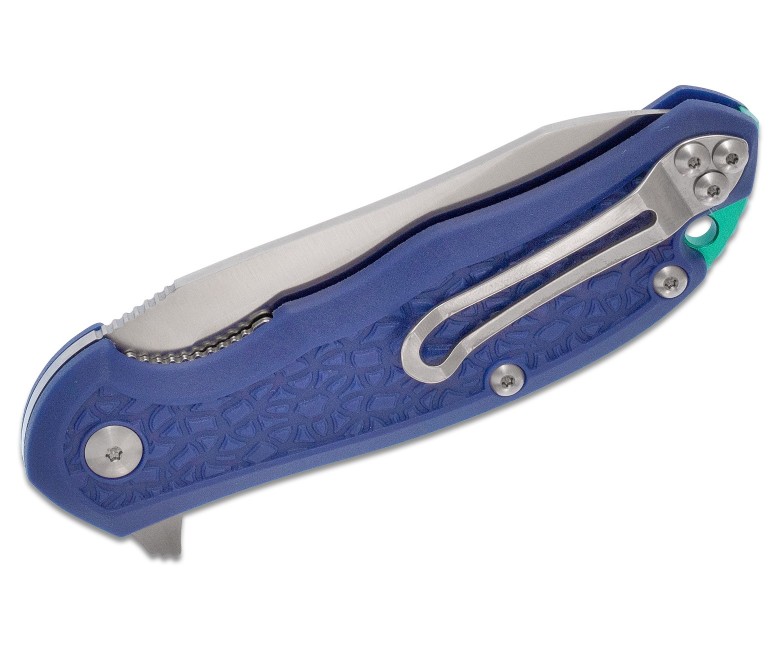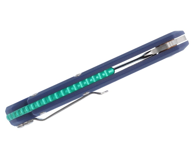 Накладки синего цвета из пластика FRN текстурированы для лучшего сцепления с ладонью. Спейсер между плашками из анодированного алюминия зелёного цвета служит не только яркой деталью, но и посадочным местом для темляка.