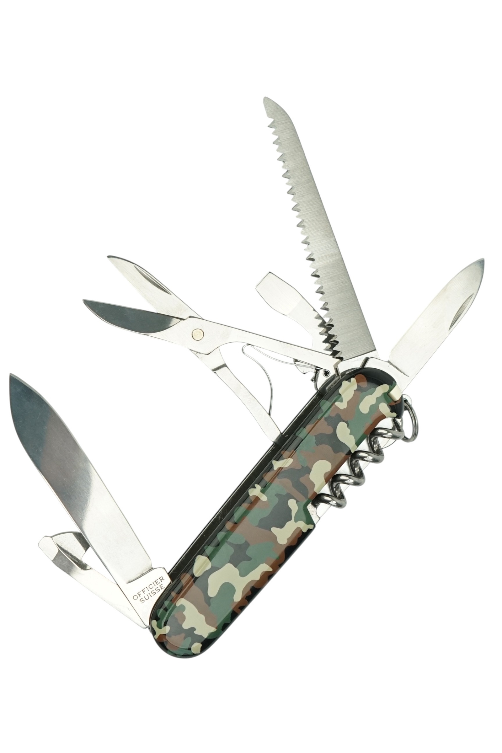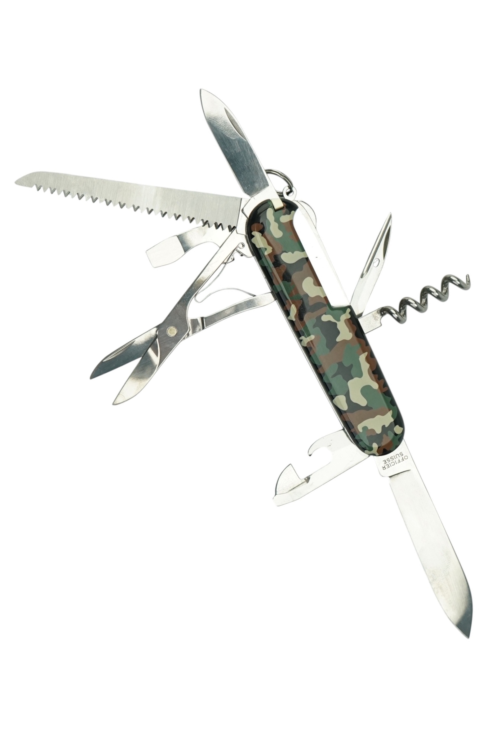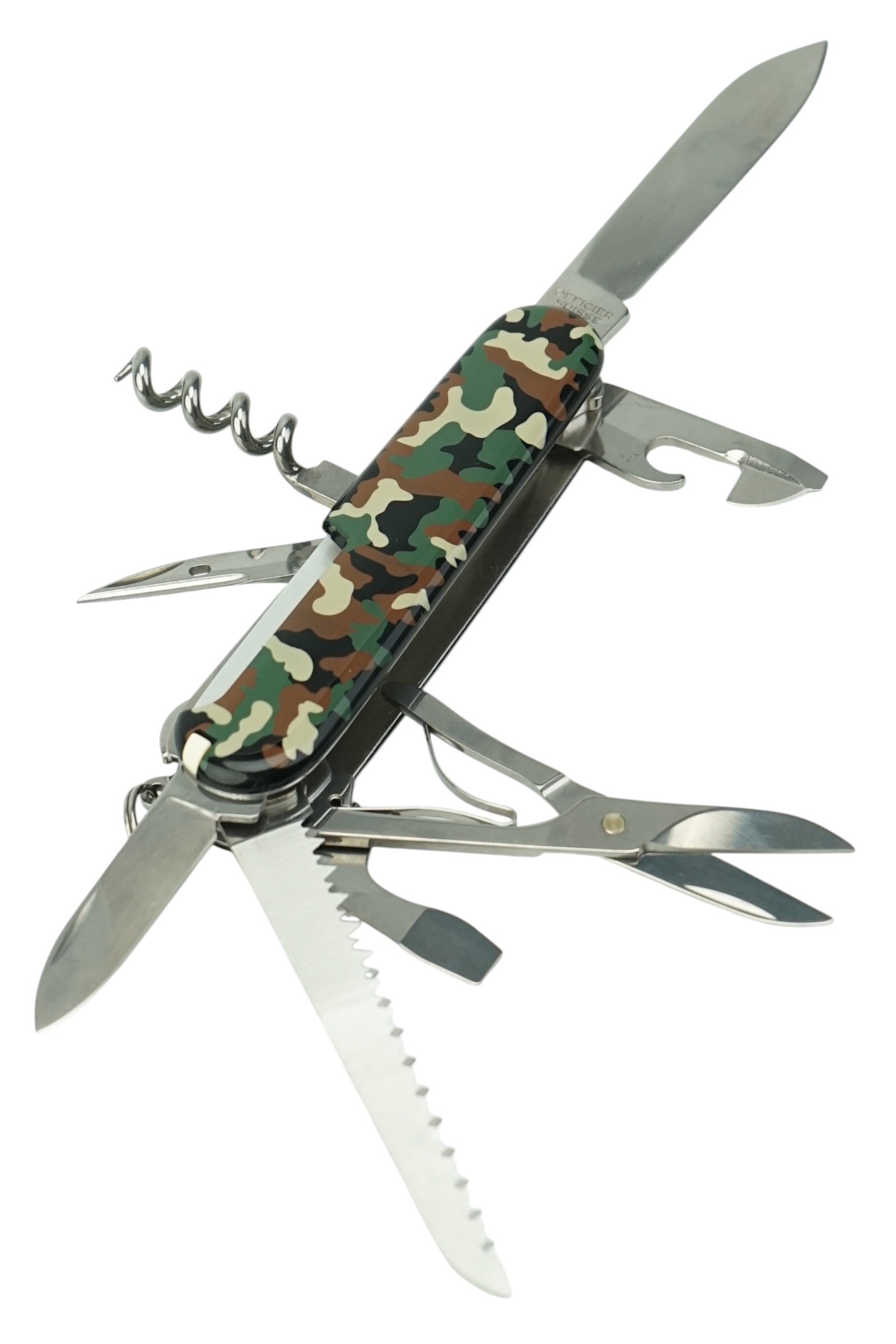 | Комплектация (?): | 1. Большое лезвие 2. Малое лезвие 3. Штопор 4. Консервный нож с: 5. - Малой отверткой (также для винта с крестообразным шлицем) 6. Открывалка для бутылок с: 7. - Отверткой 8. + Инструментом для снятия изоляции 9. Шило, кернер 10. Кольцо для ключей 11. Пинцет 12. Зубочистка 13. Ножницы 14. Многофункциональный крючок 15. Пила по дереву |