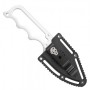 Нож поставляется в ножнах из ABS-пластика с цепочкой. На ножнах есть несколько прорезей, которые дают возможность проявить фантазию при креплении. Сам производитель позиционирует эту модель для скрытого ношения на шее. Но можно использовать крепление ножен на срезе кармана при помощи клипсы с отпечатком “Мертвая голова”.