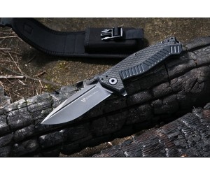 Высокая безопасность при выполнении работ и великолепная хватка оружия даже мокрой рукой обеспечивается за счет рукояти, имеющей текстурированные накладки, и клинка с плавником. Кроме этого, нож возможно дополнительно прикрепить к руке или одежде за счет отверстия для шнурка. Удобное открывание ножа обеспечивается благодаря граненой призме, закрепленной на обухе лезвия. Нож прекрасно подойдет для правшей и левшей.