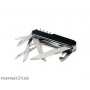 В набор встроенных инструментов входит 14 элементов, которые выполняют различные функции. Два из них (пилка и зубочистка) прячутся в рукояти. Она оббита пластиковыми накладками черного цвета. Благодаря небольшим размерам мультитула, он поместится в любой карман, а наличие специального карабина, встроенного в рукоять, предоставляет возможность повестить нож даже на связку ключей.