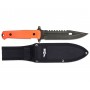 Да и сам сплав – сталь 440 – используемый в производстве этого ножа, также отлично сопротивляется воздействию жидкости и коррозии. Рукоять широкая, отделанная пластмассой, имеет передний и задний подпальцевые упоры для лучшего хвата. На крестовине есть своеобразная гарда, служащая как для дополнительного упора, так и для продевания страховочного шнура. В комплект входит чехол из кордуры.