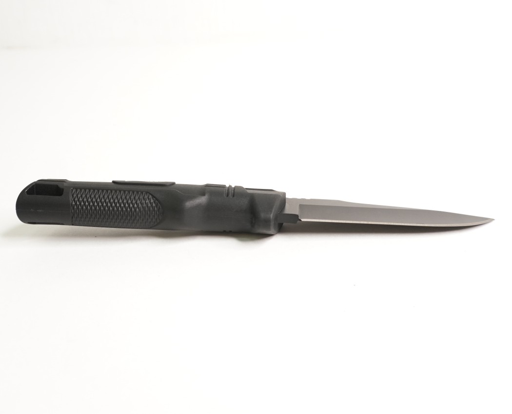 Режущая кромка этого инструмента гладкая, спуски слегка вогнутые. Рукоятка изготовлена из пластика ABS, хват удобный – как прямой, так и обратный. На рукоятке имеется гребень для жесткого сцепления с рукой. Предусмотрено отверстие для темляка.