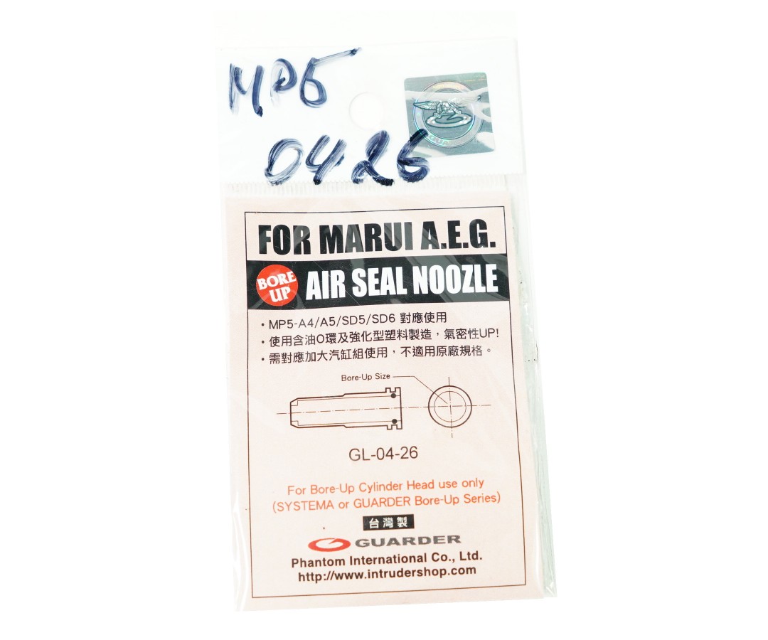 GL-04-26 - нозл для MP5-серии с уплотнительным кольцом от фирмы Guarder, Тайвань. Обеспечивает лучшую компрессию в цилиндро-поршневой группе, по сравнению со стандартным нозлом.