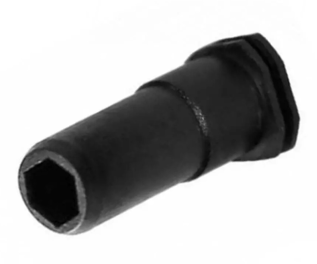Ноззл от фирмы SHS для страйкбольных приводов М4-серии с установленным внутри уплотнительным кольцом, обеспечивающим более высокую степень компрессии. Сопло ноззла имеет форму шестиугольника. Изготовлен ноззл из высокопрочного поликарбоната.