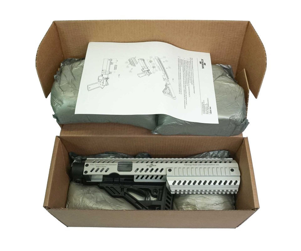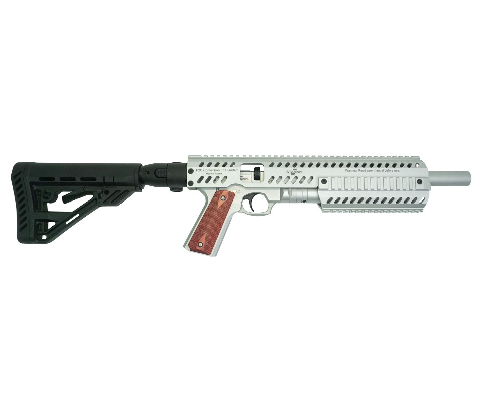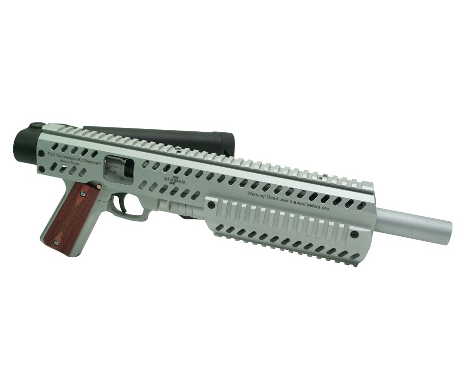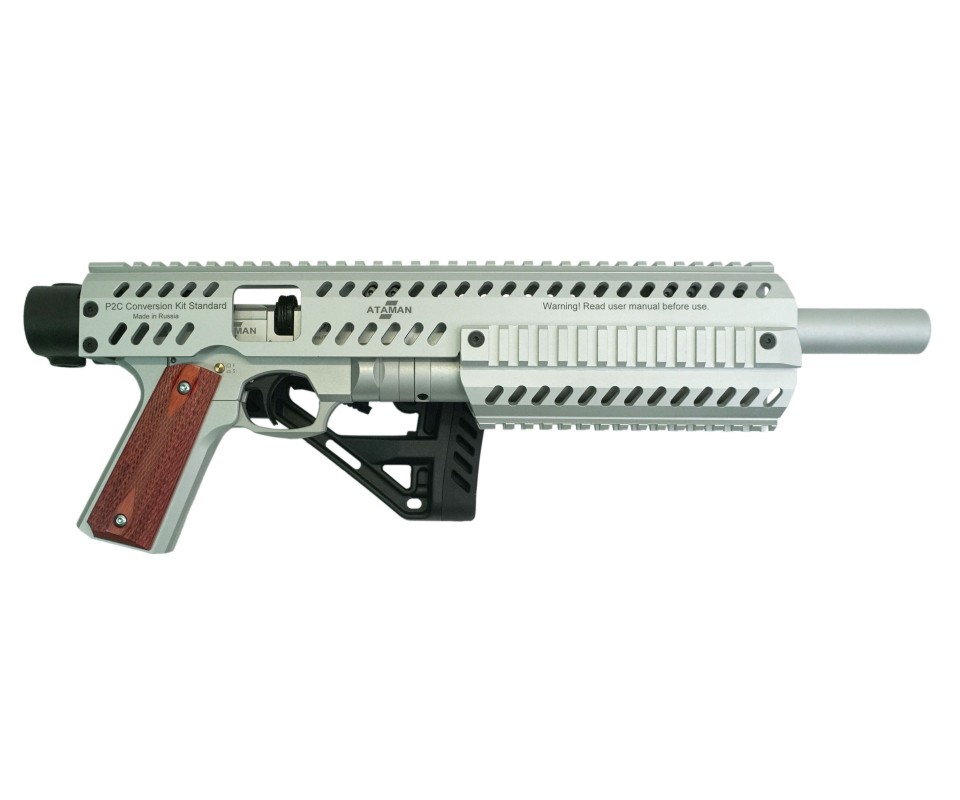Тактический обвес Р2С представляет собой конструкцию, состоящую из цевья и приклада, позволяющую модифицировать пистолет Ataman AP16 в мини-карабин. Цевье Р2С Conversion Kit по всему корпусу со всех сторон снабжено планками Пикатинни, предназначенные для установки различных тактических аксессуаров.
