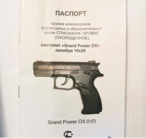Списанное охолощенное оружие с возможностью имитации выстрела патроном светозвукового действия - пистолет модели Grand Power ОХ T12 калибра 10x28 мм, является предметом хозяйственно- бытового назначения, предназначенный для приобретения навыков по обращения с оружием, для использования в культурно образовательных целях: в качестве сувенира и объекта коллекционирования, кинематографического, театрального реквизита и предмета исторических реконструкций, выставочных образцов - имитаторов, технологических образцов.