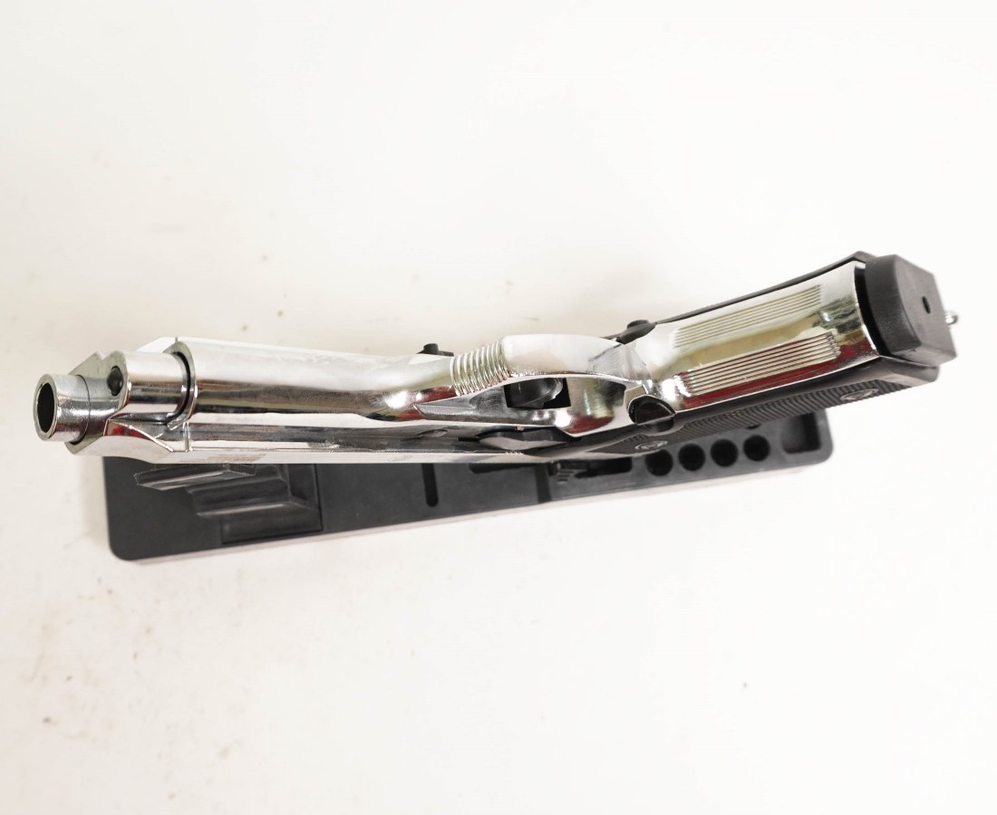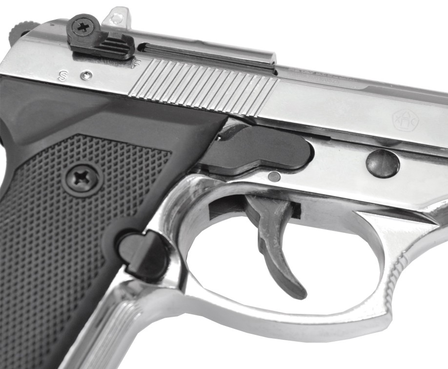 Установлен предохранитель неавтоматического типа для повышения безопасности использования пистолета. Имеются штатные прицельные приспособления – аналогично боевому экземпляру. Основной материал изготовления пистолета – сплав замак. На рукоятке – накладки из пластика.