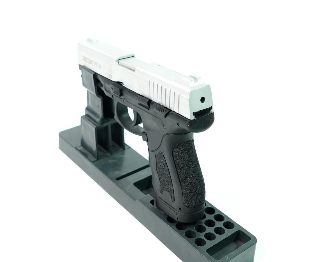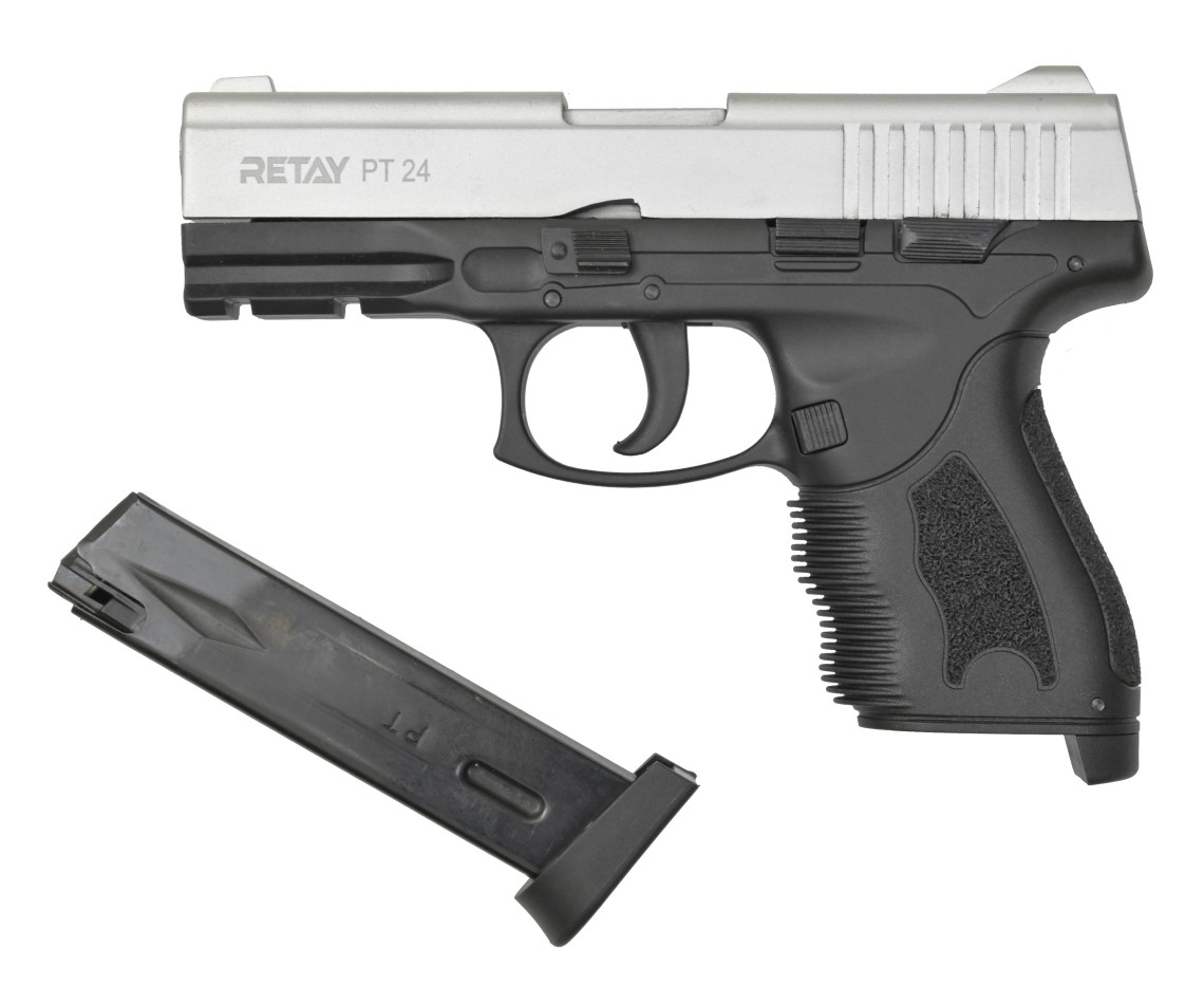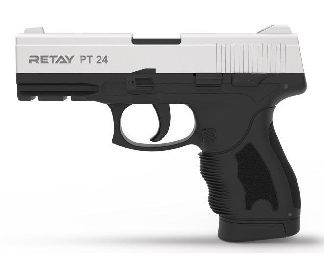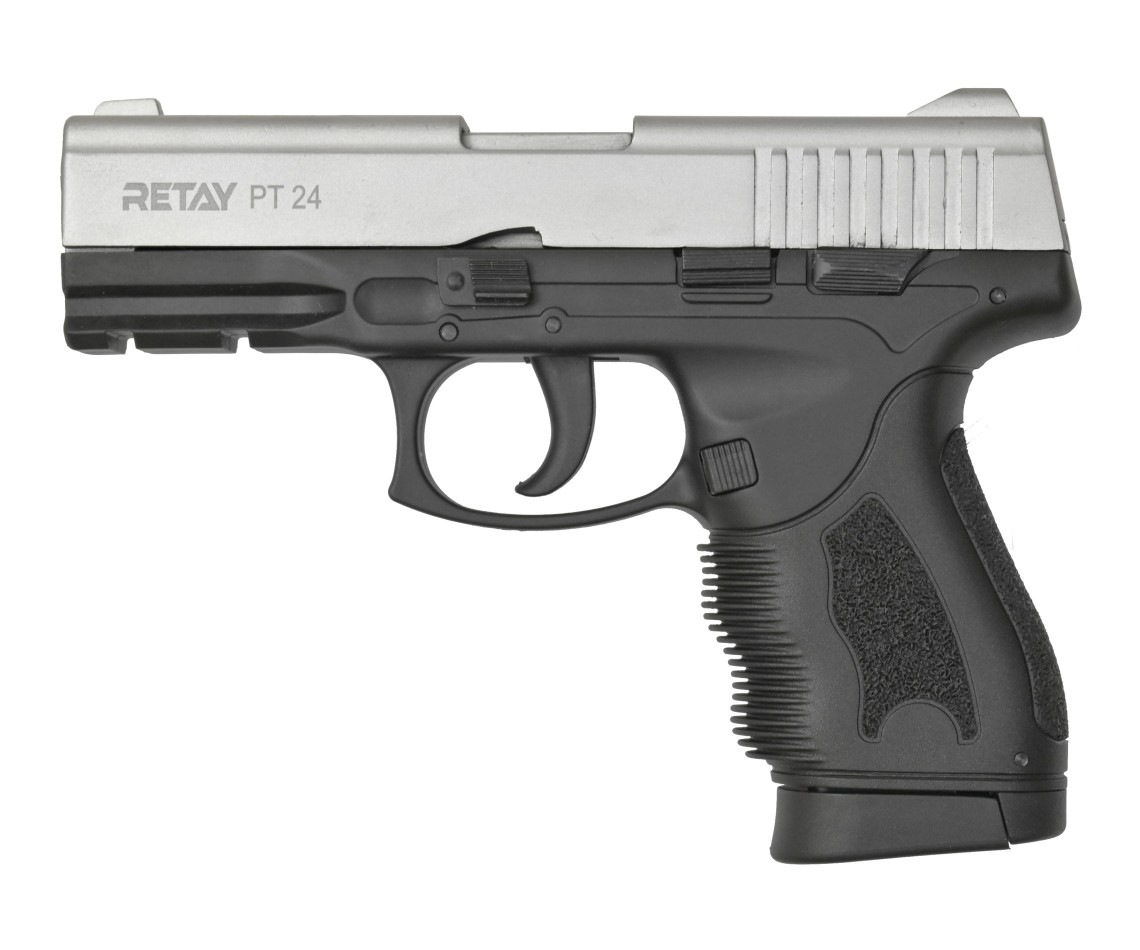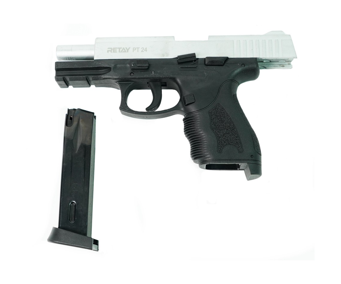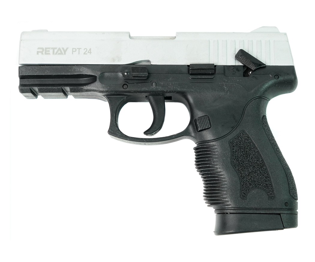 Охолощенный СХП пистолет Retay PT24 (Taurus) 9mm – это лишенная возможности стрелять боевыми патронами модификация от известного турецкого производителя, разработанная на основе бразильского самозарядного пистолета. Эта модель предназначена под свето-шумовые патроны калибра 9 мм (PA, P.A.K), которыми снаряжается 14-зарядный магазин.