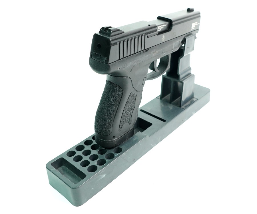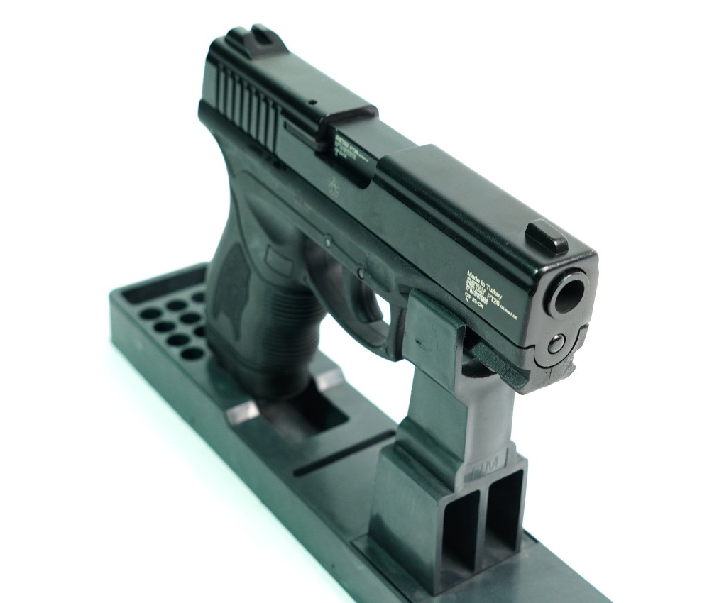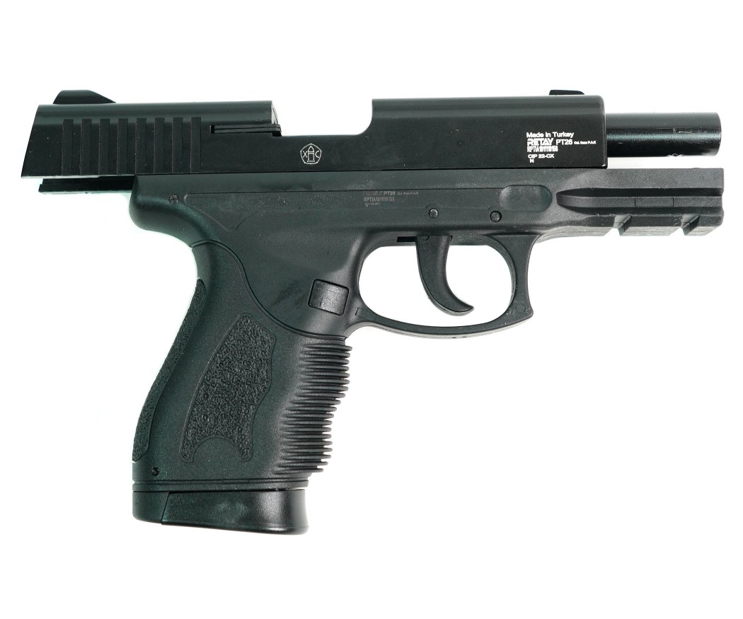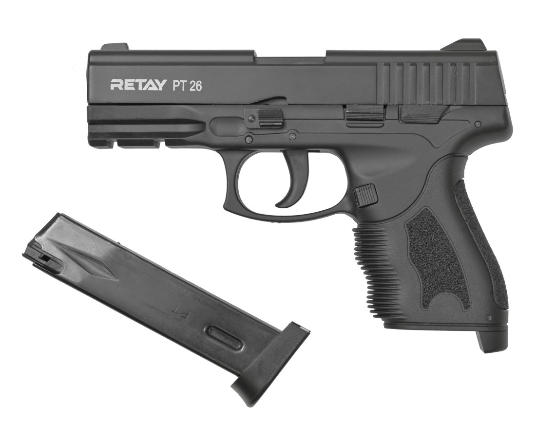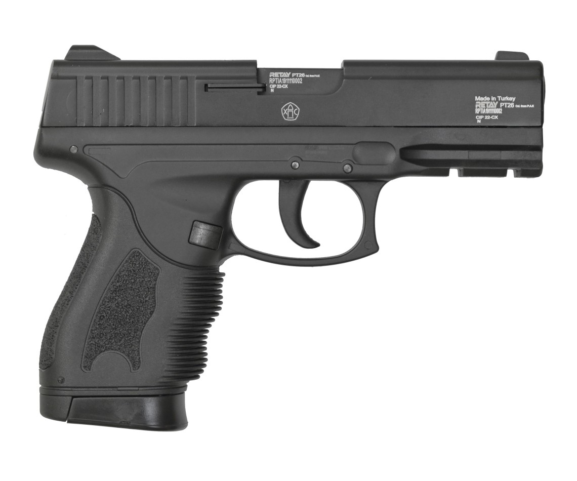 Охолощенный СХП пистолет Retay PT26 (Taurus) 9mm – это лишенная возможности стрелять боевыми патронами модификация от известного турецкого производителя, разработанная на основе бразильского самозарядного пистолета. Эта модель предназначена под свето-шумовые патроны калибра 9 мм (PA, P.A.K), которыми снаряжается 14-зарядный магазин.
