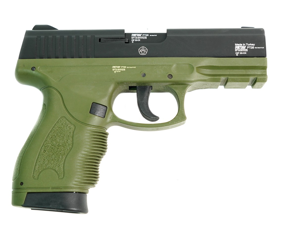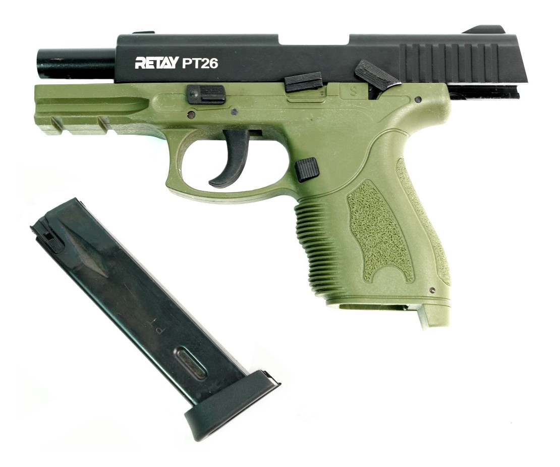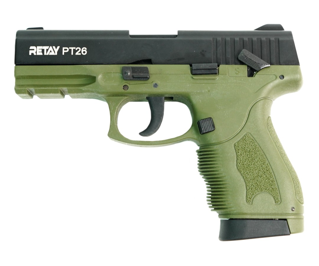 Охолощенный СХП пистолет Retay PT26 (Taurus) 9mm – это лишенная возможности стрелять боевыми патронами модификация от известного турецкого производителя, разработанная на основе бразильского самозарядного пистолета. Эта модель предназначена под свето-шумовые патроны калибра 9 мм (PA, P.A.K), которыми снаряжается 14-зарядный магазин.