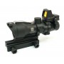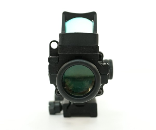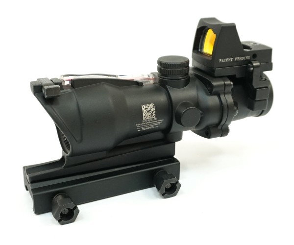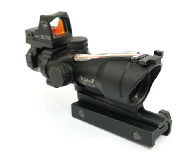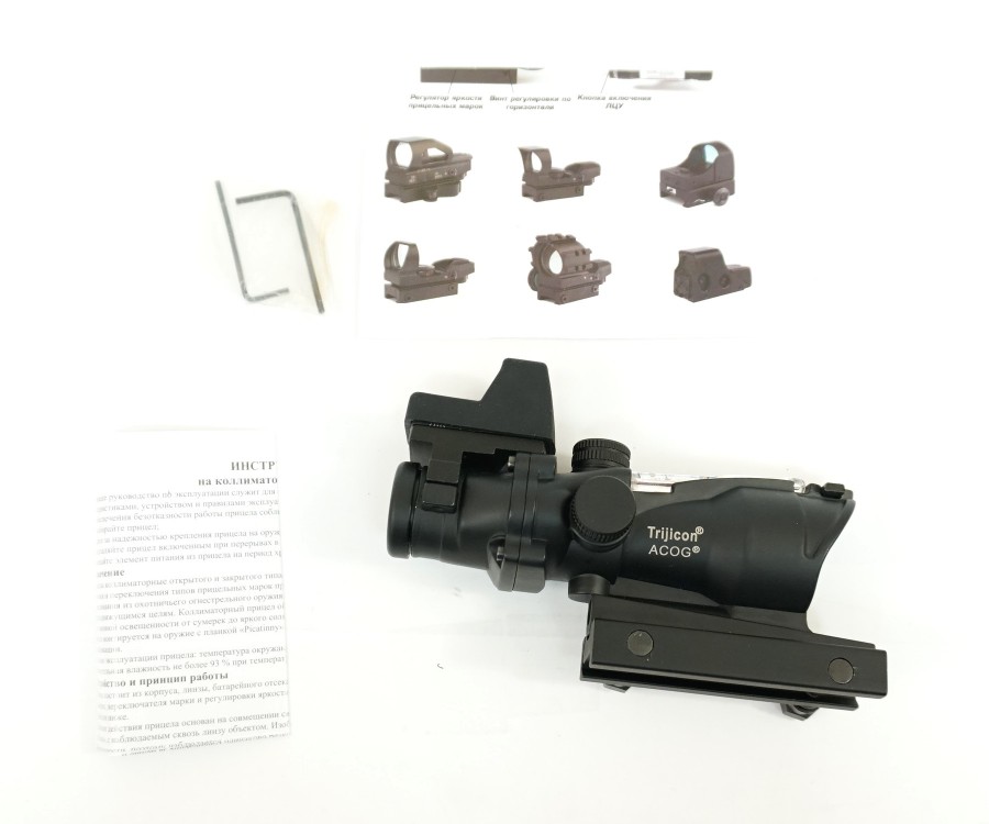 Оптический комплекс Trijicon ACOG 4х32, с подсветкой – точно выполненная копия оригинального экземпляра, объединяющего одновременно два прицела – коллиматорный и призматический. Реплика произведена в Китае, имеет доступную стоимость и будет интересна поклонникам страйкбола. Входная линза комплекса имеет в диаметре 32 мм при размере входного зрачка 8 мм. Использование здесь просветленной оптики обеспечивает возможность работы с устройством в условиях пониженной видимости.