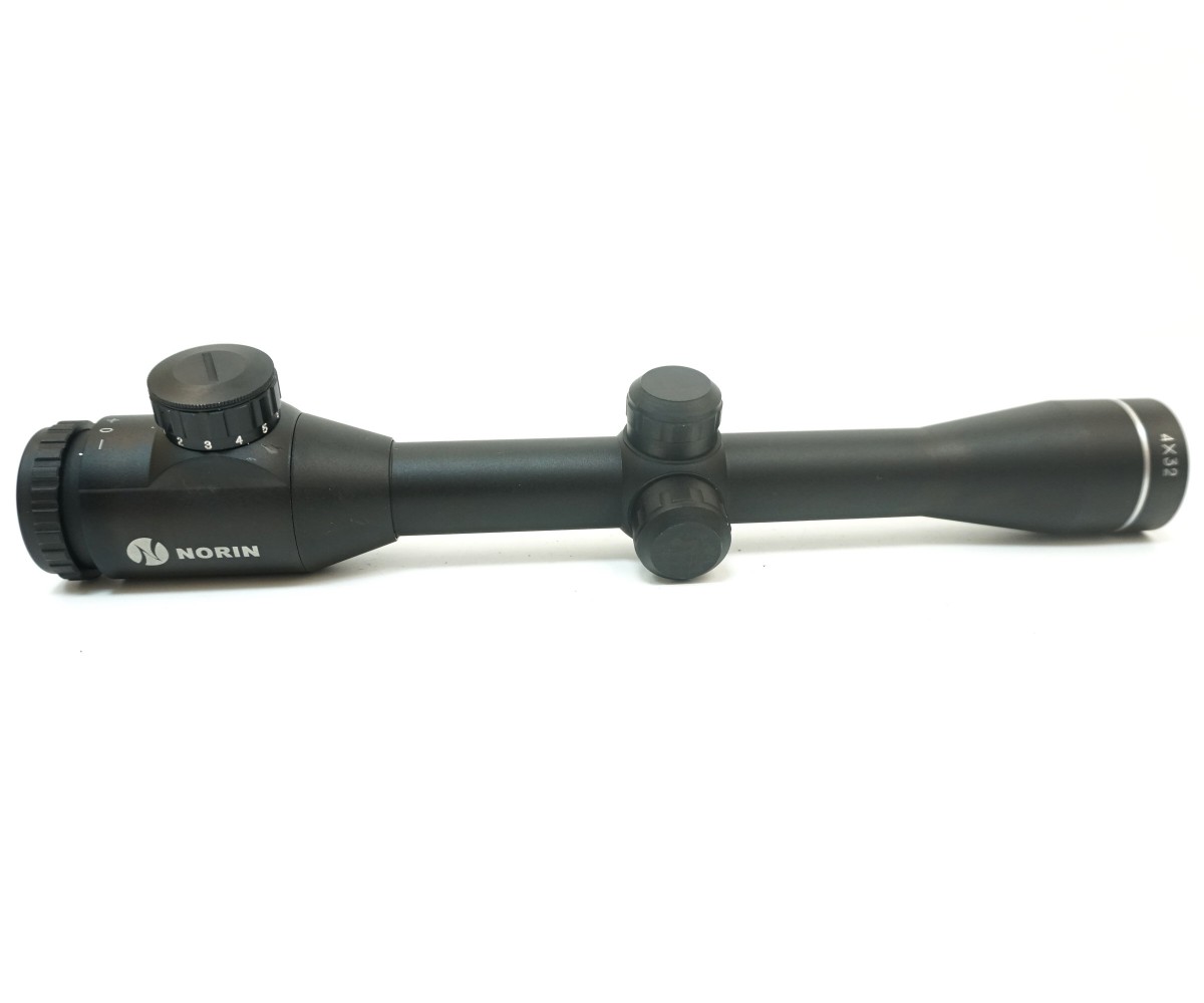 Оптический прицел 4х32 E торговой марки Norin (китайская компания, созданная в 1979 г.) с четырехкратным увеличением и шагом выверки 0.25 МОА, обладает корпусом классической формы, выполненным из сплава алюминия, благодаря чему имеет малый вес - всего 320 г. Его небольшие размеры вместе с легкостью, позволяют брать его с собой на охоту при любых условиях.