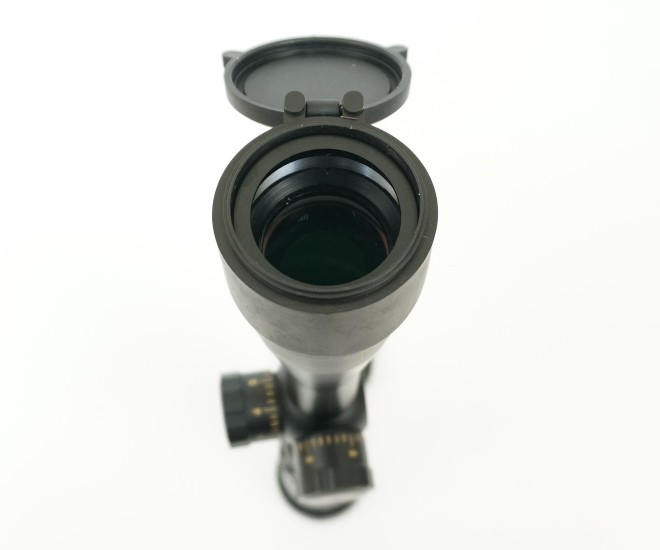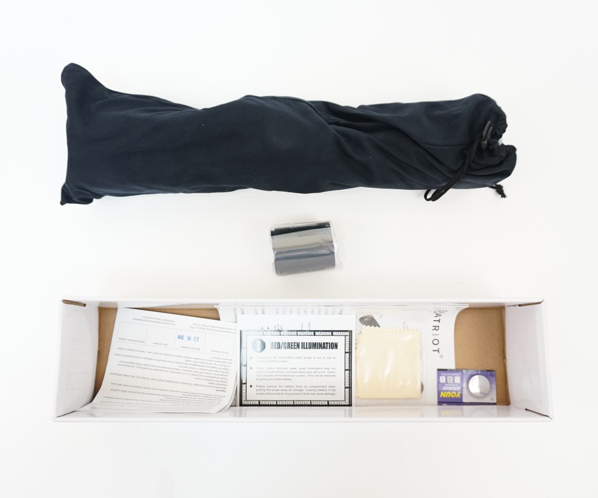 Прицел имеет водонепроницаемый и ударопрочный корпус из алюминиевого сплава, обработанного специальным покрытием Black Matte с матовой фактурой. Конструкция прицела разработана с учетом нагрузок, возникающих при выстреле. Корпус цельнометаллический. Весит прицел 0,57 кг, его длина 34,4 см. В комплект входят крышки линз, фибровая ткань для оптики, батарейка и инструкция. Упакован прибор в картонную коробку.
