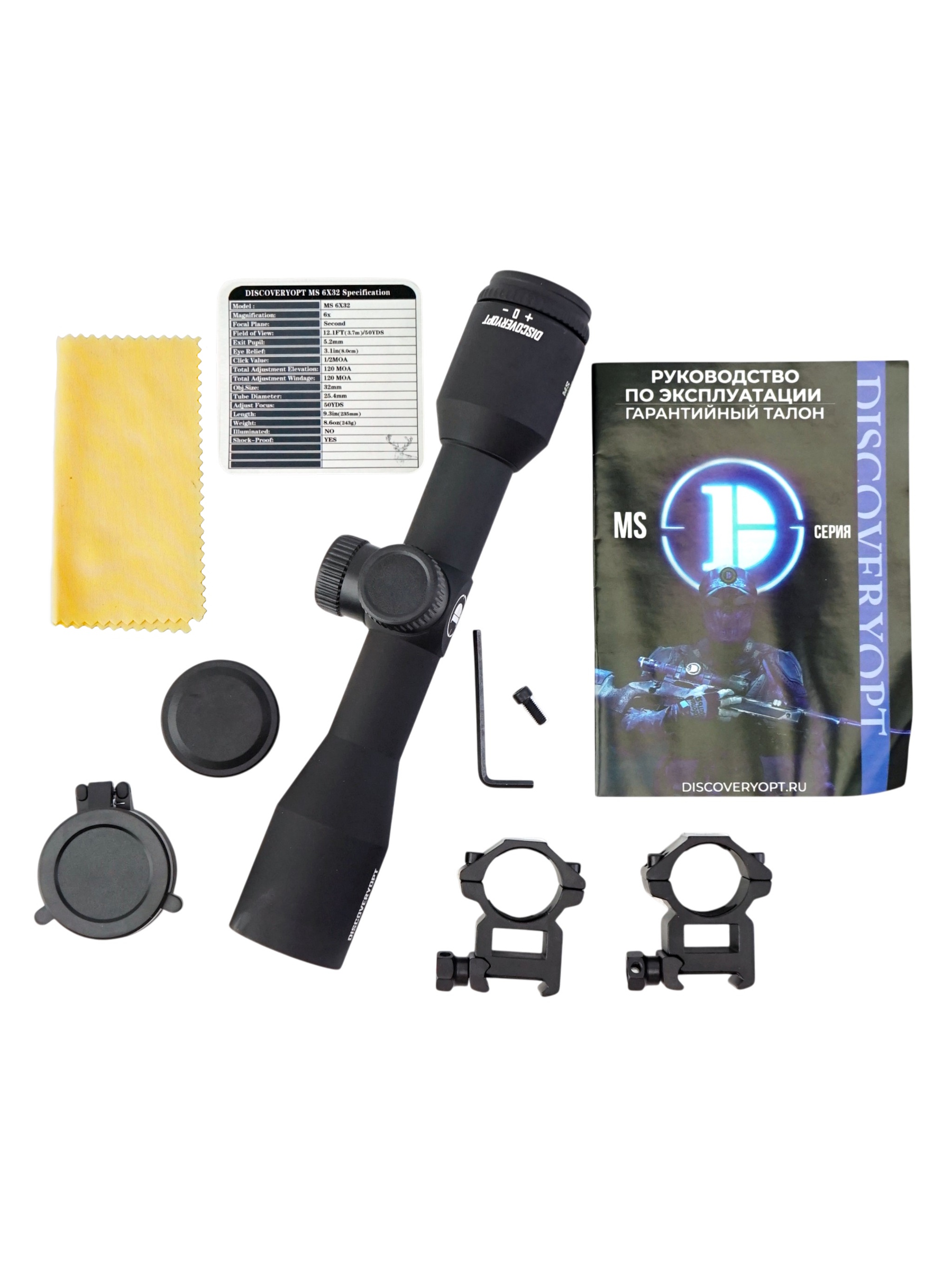 | Комплектация (?): | прицел, кольца, защитные крышки, салфетка для протирки, шестигранник, инструкция |